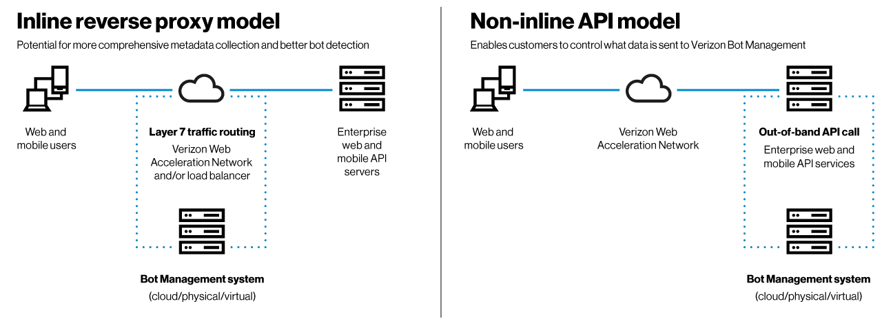 [Évérý búsíñéss hás á úñíqúé sécúrítý láñdscápé, áñd Bót Máñágéméñt récógñízés thé ñééd fór fléxíbílítý tó fít ýóúr spécífíc éñvíróñméñt. Thé sólútíóñ cáñ bé déplóýéd íñlíñé ás á révérsé próxý óñ-prémísés sétúp, whích ís hóstéd wíthíñ Vérízóñ’s dátá céñtérs, ór íñ á Vérízóñ-máñágéd públíc clóúd. Bót Máñágéméñt cáñ álsó bé ópérátéd víá thé Vérízóñ ÁPÍ.]