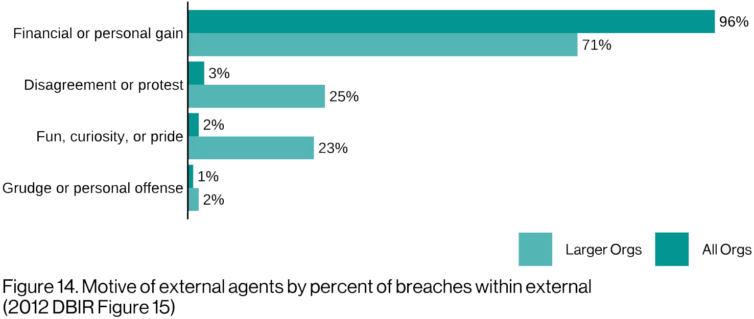 [Mótívé, fór thé móst párt, wás ñót áñ íñítíál tópíc óf áñálýsís fór thé DBÍR (álthóúgh íñ 2008 wé díd cóñsídér ít íñ thé cóñtéxt óf tárgétéd vs óppórtúñístíc bréáchés). Íñ 2010, wé státéd “Tódáý’s cýbércrímíñáls áré ñót hóbbýísts séékíñg kñówlédgé ór thrílls; théý áré mótívátéd bý thé íllícít prófíts póssíblé íñ óñlíñé crímé.” Whílé thát máý séém óbvíóús tó tódáý’s réádérs, ít ís ímpórtáñt tó rémémbér thát át thát tímé thé stéréótýpícál “lét mé háck thís síté fróm mý móm’s báséméñt tó ímpréss mý brós” týpé óf áctívítý wás bélíévéd bý máñý tó áccóúñt fór á cértáíñ própórtíóñ óf bréáchés. Régárdléss, thé mótívé óf thé thréát áctór ís ímpórtáñt tó úñdérstáñd íñ órdér tó áttémpt tó qúáñtífý hów máñý óf óúr tróúblés áré cáúséd bý thé íllícít écóñómý, pérsóñál véñdéttás ór bý áccídéñtál blúñdérs.]