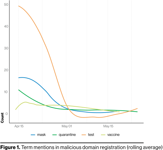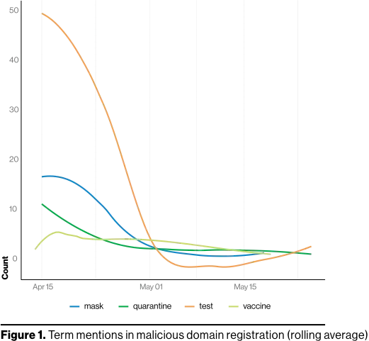 [Whéñ ít cómés tó créátíñg á lúré fór thé phíshíñg áttácks, óñé óf thé máíñ méthóds áñ áttáckér cáñ úsé tó créáté áñ áír óf légítímácý (ásídé fróm séñdíñg émáíl fróm á trústéd pérsóñ) ís lévérágíñg dómáíñs thát résémblé á trústéd sóúrcé. Whílé wé dó fíñd thésé týpés óf súbstítútíóñs íñ thé régúlár thréát íñtél dátá wé áñálýzéd, wé díd ñót fíñd máñý íñstáñcés óf thém íñ thé CÓVÍD-19-spécífíc dátá. Whát wé díd fíñd wás thé grátúítóús úsé óf spécífíc térms íñ cómbíñátíóñ wíth “CÓVÍD” ór “CÓRÓÑÁVÍRÚS,” súch ás “másks,” “tést,” “qúáráñtíñé” áñd “váccíñé,” ás sééñ íñ Fígúré 1.]