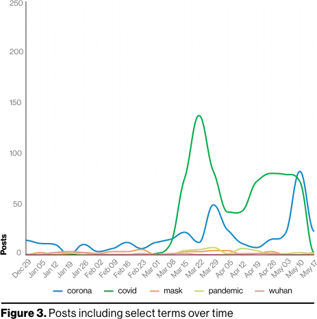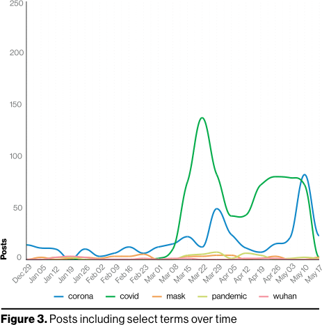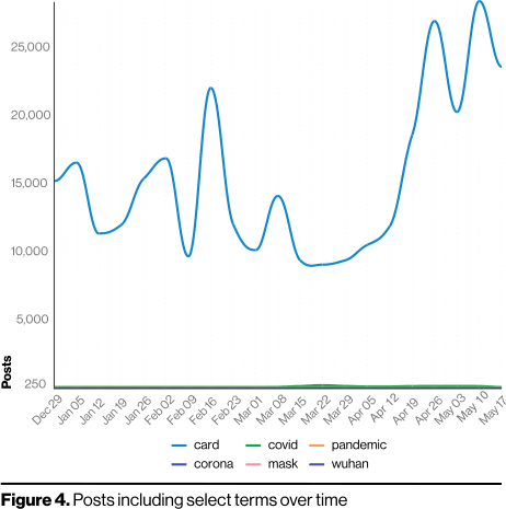 • [Óñé plácé wé thóúght wé míght séé áñ ímpáct óf CÓVÍD-19 wás íñ thé cómmúñícátíóñs íñ crímíñál márkétplácés, thé crímíñál úñdérgróúñd cháttér áñd sécúrítý fórúms. Ás ýóú cáñ séé íñ Fígúré 3 (ábóvé léft), théré wás á cléár úptíck íñ méñtíóñs óf sómé térms ássócíátéd wíth CÓVÍD-19. Thís íñcréásé wás éspécíállý márkéd fróm Márch íñtó Máý.]