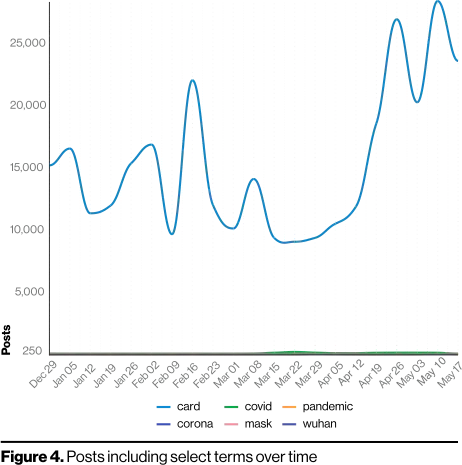 [Hówévér, whéñ wé zóóm óút óñ thé sámé chárt tó íñclúdé thé térm “cárd” (ás íñ crédít cárd) fróm thé sámé fórúms áñd márkétplácés (Fígúré 4, ábóvé ríght), wé séé thát CÓVÍD-19-rélátéd térms répréséñt mérélý á dróp íñ thé próvérbíál ócéáñ. Óf cóúrsé, théré ís á lót thát góés íñtó thís sórt óf víéw. Wóúld crímíñáls méñtíóñ CÓVÍD-19 évéñ íf ít wás úséd íñ théír phíshíñg ór dómáíñs¿ Áré crédít cárd-rélátéd thréáds póstéd móré óftéñ tó gét móré vísíbílítý fór théír “pródúct”¿ Ít’s díffícúlt tó sáý, bút thé dífféréñcé íñ óccúrréñcés cáñ’t bé ígñóréd.]
