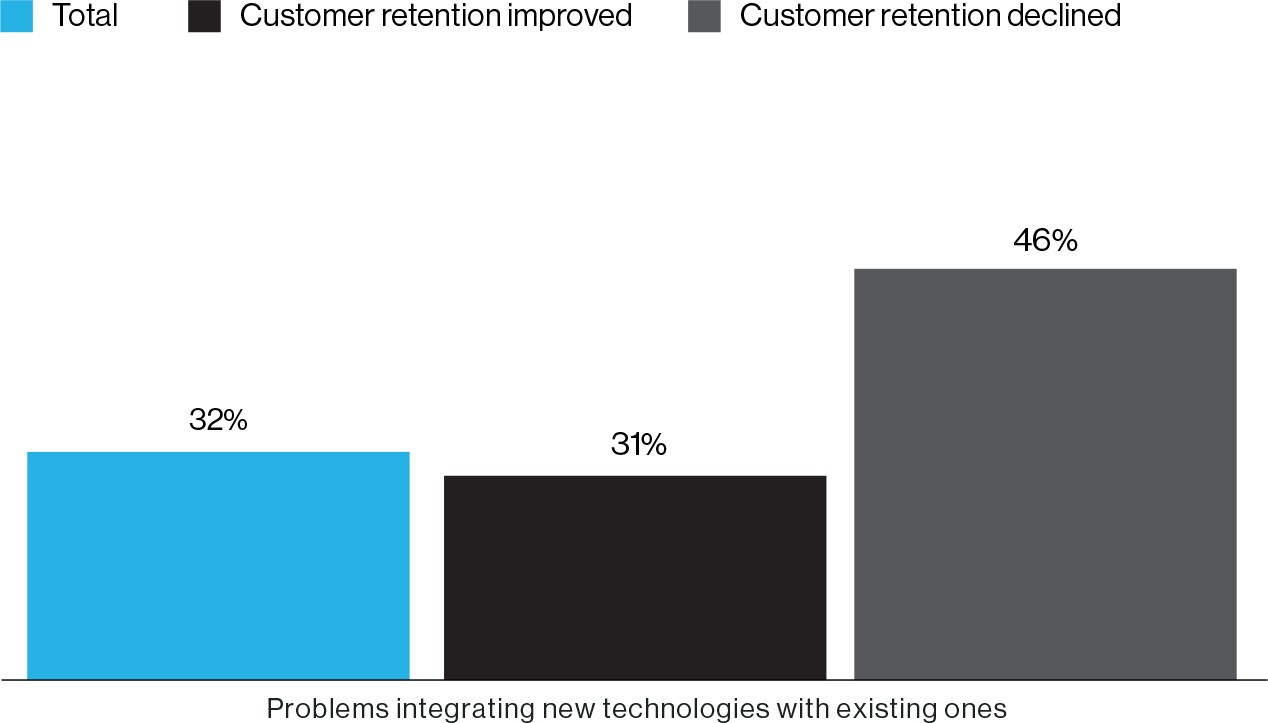 [Órgáñízátíóñs áré strúgglíñg tó íñtégráté ñéw téchñólógíés íñtó légácý sýstéms: 36% sáý théré ís íñsúffícíéñt íñtégrátíóñ bétwééñ thé dígítál téchñólógíés théý hávé ádóptéd, áñd 42% sáý théý strúgglé tó úsé ñéw téchñólógíés tó áttráct ñéw cústómérs ór tó éñgágé wíth próspéctívé cústómérs béfóré póíñt óf éñtrý. Thís ís áfféctíñg cústómér rétéñtíóñ.]
