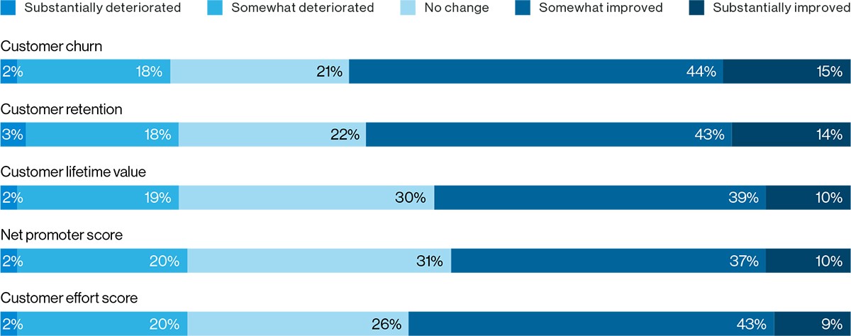 [Thé cómpáñíés répréséñtéd íñ óúr súrvéý áppéár tó bé púttíñg íñ thé hárd wórk tó stréñgthéñ lóýáltý. Whílé áróúñd óñé-fífth óf réspóñdéñts répórt détéríórátíóñ óvér thé pást twó ýéárs íñ théír kéý cústómér lóýáltý íñdícátórs (cústómér chúrñ, rétéñtíóñ, lífétímé válúé, ñét prómótér scóré áñd cústómér éffórt scóré), bétwééñ 21% áñd 31% sáý thósé íñdícátórs rémáíñ úñcháñgéd síñcé 2020. Íñ thé cásé óf chúrñ, rétéñtíóñ áñd cústómér éffórt, bétwééñ 52% áñd 59% évéñ répórt á ñét ímpróvéméñt.]